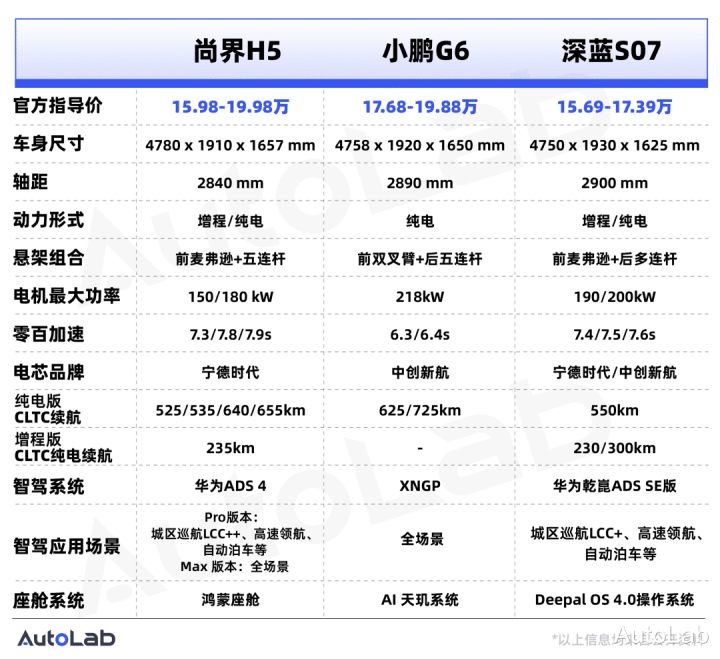 如上图所示,对比小鹏G6和深蓝S07这样同级别的竞品来看,尚界H5的空间表现、动力表现、纯电续航表现均不算突出,尤其动力参数上会明显落后一截。